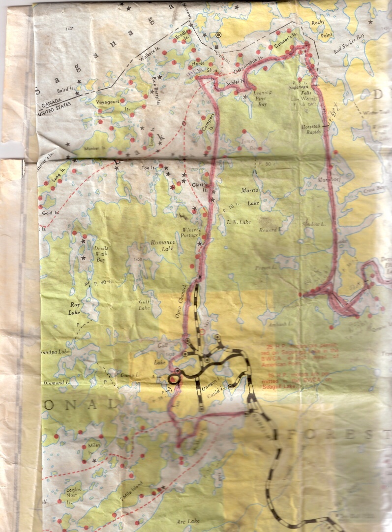 I remember debating whether to stay at the lodge overnight or trying to catch up to our planned schedule. Much to my regret, we took the cheap route. It wasn’t as if we had a whole lot of cash to spare! So, we loaded our gear into the canoes and took off. I think we only had one map. Doug had that since he was the one who planned our route and obtained the gear, so he rightly declared himself the trip navigator.