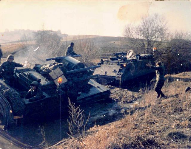 I don’t remember the precise timeline, but the standard procedure for an alert was to get full accountability of all our unit personnel within one hour of the initial kick-off. We then had another hour to get our equipment loaded onto our vehicles and lined up to depart the back gate of our small Kaserne. Some of the tasks during that second hour were: issuing weapons and gas masks to every Soldier, obtaining communication encryption codes, and Operations Order briefings that went first to the Battery Commanders from the Battalion Commander, then from the Battery Commanders to Platoon Leaders, and finally from the Platoon Leaders to the Squad Leaders (or simply to the entire Platoon). The typical instructions were to proceed via “road march” (i.e., riding in our tactical vehicles/weapon system to our nearby Basic Load Storage Area. We would stage our vehicles in the woods and in sequence load our full compliment of weapon systems. For us, that meant guided missile systems for the Chaparral and Stinger teams and 20mm basic load for the Vulcan anti-aircraft guns.